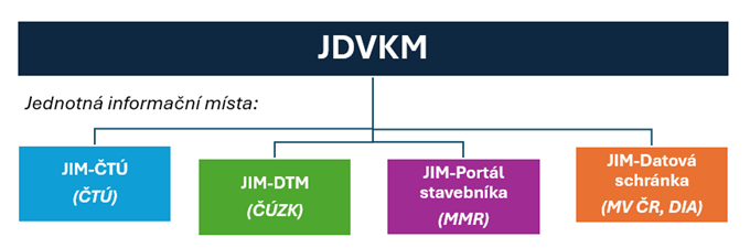 Jednotné digitální vnitrostátní kontaktní místo (JDVKM) je místo, které vytvoří ČTÚ a napojí je na jednotlivá Jednotná informační místa (JIM) na obrázku.