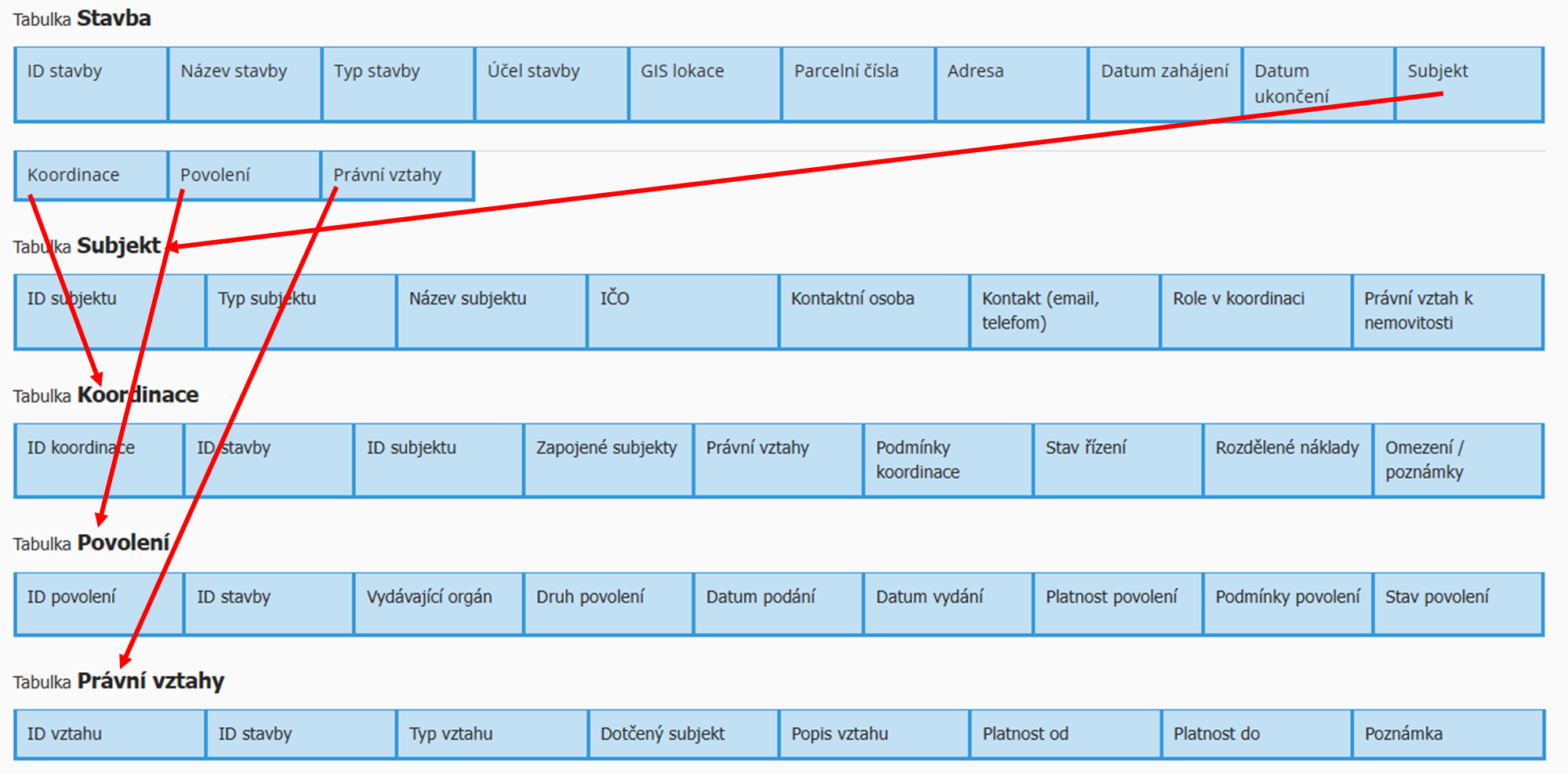 · Každá stavba může mít více účastníků (subjektů) – klíč ID stavby propojuje tabulku Subjekt s tabulkou Stavba.
